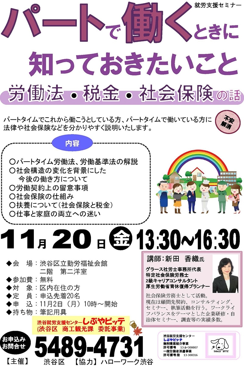 パートタイムでこれから働こうとしている方、パートタイムで働いている方に、法律や社会保険などを分かりやすく説明いたします。
