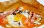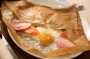 そば粉のガレット生地に ホタテのポワレ、チーズ、トマト、 長ネギのフォンデュ、サラダがのります。 そば粉のガレット生地に 卵・キノコソテー・有機トマト・ポテト・ グリルベーコンがのります。