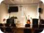 カフェスペース。小さな集会を行うほか、階段を登らずに礼拝できるモニターがあります。卓球台や、ダーツもあります。