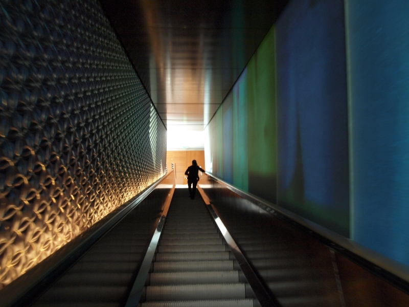 スタイリッシュな壁に囲まれたエスカレーターは、まさに異空間!