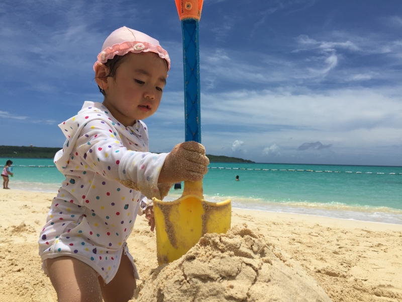 子供も去年はいやがった砂浜で、砂遊びをしたり