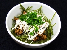 ピリ辛のひき肉がのった、おかずごはん。玄米と白米をブレンドして炊いたごはんなので白米だけでは出ない甘みがピリ辛によく合います。