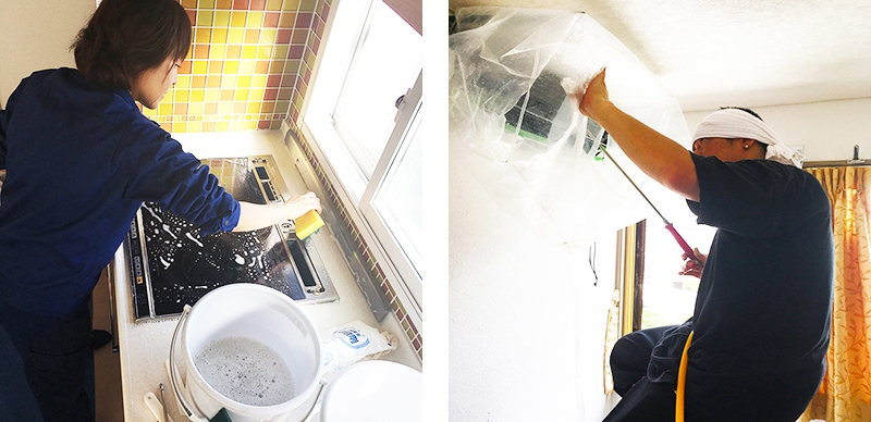 | ナチュラルハウスクリーニングは、子育てや仕事で忙しいママさんや、掃除や整理がむずかしくなった高齢者の皆さんに人気があります。アトピーやアレルギーのご家族にも安心です。 | エアコンの送風口から黒カビが見えたら、クリーニング時、お部屋にまき散らされないうちに高圧洗浄するのがオススメです。秋冬は予約をとりやすいので、気軽にお問い合わせ下さい。 |