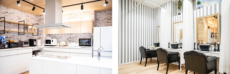 大型TV・エアコンをはじめ、白物家電に加え、高級美容家電が使えるセルフエステ、カフェを併設。