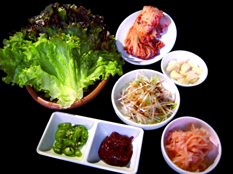 一緒にサンチュで包み、ご賞味いただきます。お口の中でミックスして起きる最高の味をお楽しみ下さい。