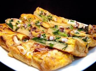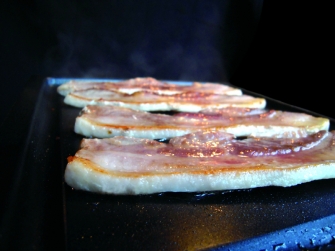 石盤で焼いたジューシーな豚三段バラ肉、キムチ、ニンニクをサムジャン(味噌)、ネギ、青トウガラシと