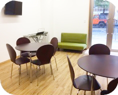 カフェスペース。小さな集会を行うほか、階段を登らずに礼拝できるモニターがあります。卓球台や、ダーツもあります。