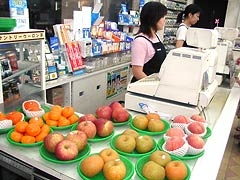 他のコンビニとちょっと違っているのは、レジの横に新鮮な果物が並んでいること。
