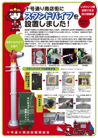 商店街に設置してあるスタンドパイプを使用し、実際に放水しての防災消火訓練を行います。